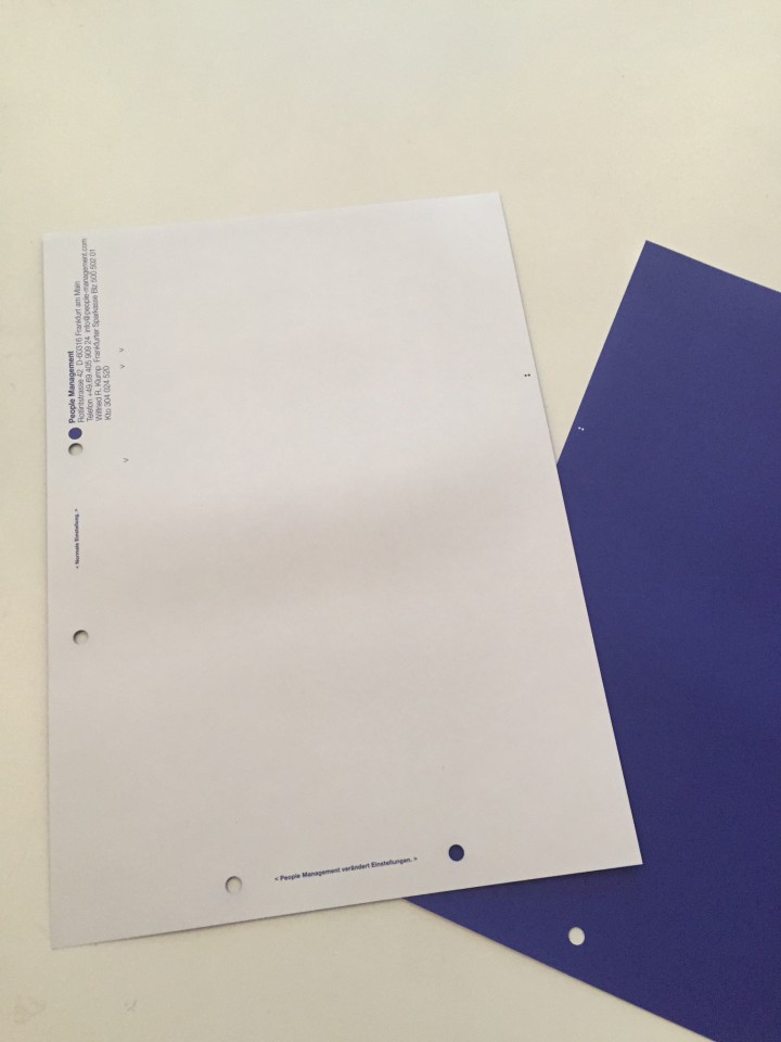 People Management Geschäftsausstattung mit Firmenphilosophie an ungewöhnlichen Lochungen. „people management verändert Einstellungen“.