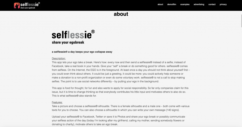This app lets your ego take a break. Here’s how: every now and then send a selflessie® instead of a selfie; instead of Facebook, take a real book in your hands. Give your “self” a break or do something good for others. selflessie® comes from selfless. On the Internet, the EGO is in the foreground. At least once a day you should not think about yourself first – you could even think about others. It could be just a greeting, it could be more: you could actively help someone or make a donation to a non-profit organization or even do some voluntary work. selflessie® is not a call to stop making selfies. The point is to use social networks differently – by putting your ego in the background.